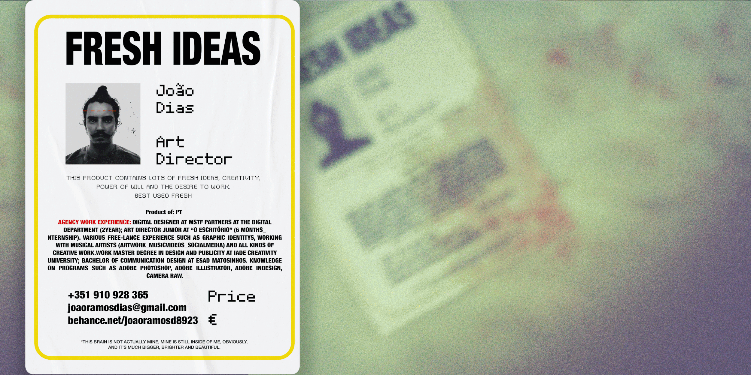 Fresh Ideas - I sent to these 5 Art Directors a brain from a real animal, with a sticker that had my CV. The sticker design was inspired in a butchers receipt and the whole idea was to show how I am not afraid to have fresh and disrupting ideas that gain the target’s attention.