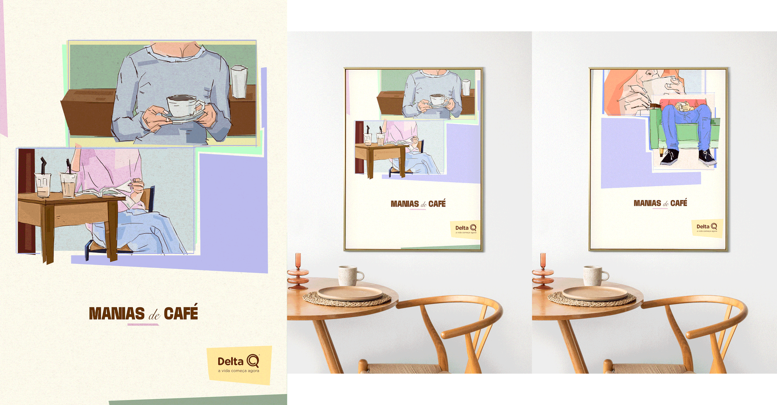Este cheiro, de um castanho intenso, cresceu connosco, enquanto nos sujávamos a brincar na lama, nos dias chuvosos, o café, dessa mesma cor, aquecia-nos e com ele crescemos. Nas viagens de família, o pai parava na bomba de gasolina, e lá íamos beber aquele café, tirado da máquina, com um gosto de aventura. E o que dizer sobre o café de saco, na casa da avó, acompanhado pela bolacha enterrada na chávena, a pingar doçura, ou mesmo o café com “cheirinho”, introduzido por um familiar mais velho, às escondidas das mães zelosas. E quando as tainadas da nossa juventude começam, o café é o último a vir para a mesa. Presente até ao presente. Naquele encontro, sem contar, o que dizemos primeiro: “Vamos tomar um café”? A entrevista de emprego, para pôr todos à vontade,: “deseja um café?”. O café está sempre lá, no nosso dia-a-dia. É tão nosso, tão português. Todos nós temos o nosso “momento café”. Através dessa ideia, o artista, recorrendo à banda desenhada, que gosta quase tanto como de café, recria em vários cenários esses momentos. Dando liberdade ao pensamento de quem observa os cartazes: é uma entrevista, um primeiro encontro? O fim de outros encontros? ou apenas aquele momento “relax”, a rodar a colher, dando voltas nessa cor quente, de um castanho fervente, enquanto se clareia a mente ou se mergulha a alma na espuma do nada. Com uma paleta colorida, um mix entre o traço sarrabiscado e as formas geométricas, nasce uma composição de fácil agrado ao olho, um cartaz para se ter na sala, na cozinha, algo para contemplar enquanto se leva a chicara à boca, a escaldar, e soprando,distraídos, nos contemplamos, com algo ou sem.